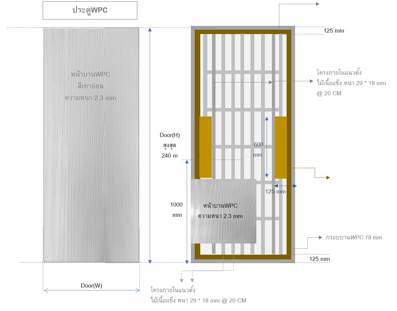 - โครงสร้างบานภายในบาน ผลิตตามมาตรฐาน มอก.192-2549 เสริมจุดรับอุปกรณ์กลางบาน ด้วยแป้นรับอุปกรณ์ ขนาดพิเศษ 12.5x60cm. (สำหรับบานประตูwpc ที่มีความสูงมากกว่า 220cm. เพิ่มความแข็งแรงด้วยการเสริมโครงสร้างเหล็กกล่องภายในตัวบาน)